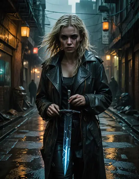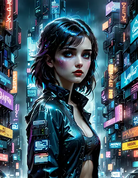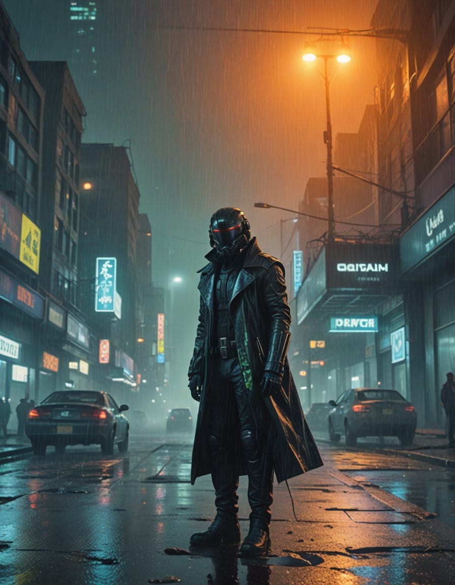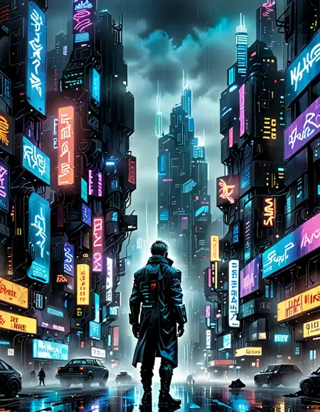 우울하고 분위기 있는 톤으로 시네마틱한 사이버펑크 미학을 구현하세요. 세부적인 질감, 고도의 기술, 역동적인 조명을 통해 미래적 요소와 거친 요소를 융합하세요. 파란색, 녹색, 빨간색의 화려한 네온 액센트가 있는 어두운 톤을 주조색으로 하는 차가운 색조 팔레트를 사용하세요. 반사 표면, 비, 안개 같은 요소를 도입하여 깊이와 분위기를 강화하세요. 빛과 그림자 간의 고대비를 유지하여 캐릭터, 객체, 환경 등 모든 장면이 고기술적이고 반유토피아적인 세계를 몰입감 있고 감성적으로 전달하도록 하세요.