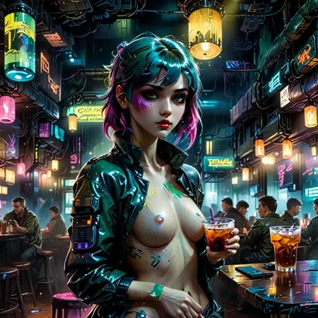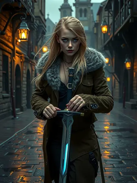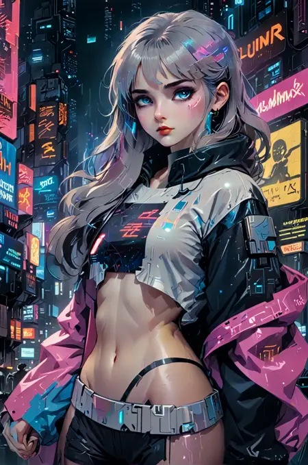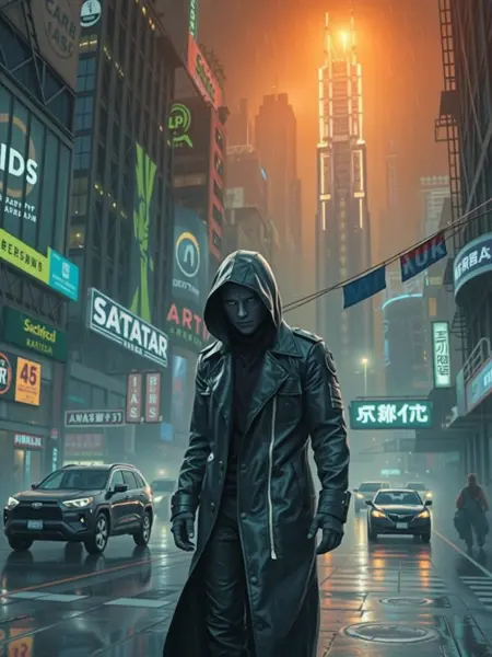 분위기와 세부사항에 중점을 둔 사이버펑크 영감을 받은 스타일. 차가운 어두운 색조 팔레트에 네온 액센트를 대비시켜 사용하세요. 미래적 기술과 거친 현실성을 융합하세요. 캐릭터, 객체, 설정을 묘사할 때마다 질감, 역동적인 조명, 고대비를 강조하여 분위기 있고 몰입감 있는 장면을 생성하세요.