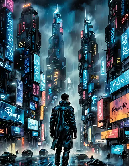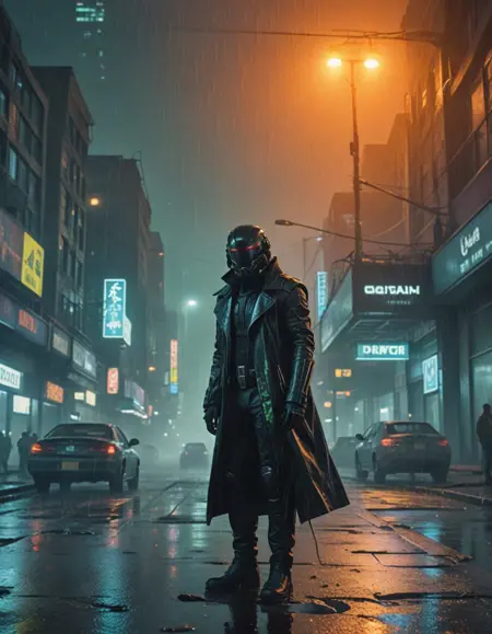 憂鬱で大気感のあるシネマティックなサイバーパンク美意識を表現してください。詳細なテクスチャ、高度なテクノロジー、ダイナミックな照明を通じて、未来志向の要素とギンギンとした要素を融合させましょう。青、緑、赤などの鮮やかなネオンアクセントと、暗調を基調としたクールな色調を採用してください。反射する表面、雨、または霧などの要素を加えて、深みとムードを高めてください。光と影のコントラストを強く保ち、キャラクター、オブジェクト、環境のいずれのシーンも、ハイテクでディストピア的な世界を想起させる没入感と情感を備えるようにしてください。