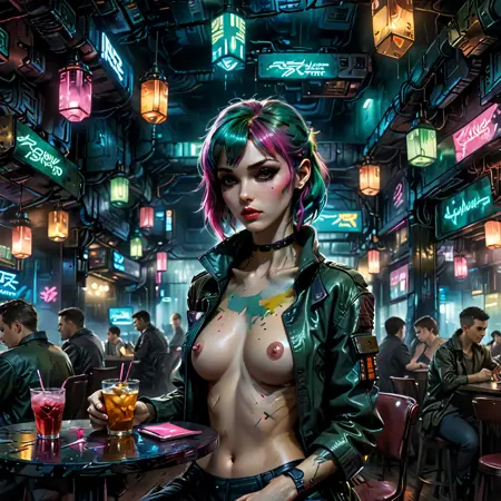 ムードとディテールに焦点を当てたサイバーパンクインスパイアされたスタイル。クールでダークな色調にネオンアクセントを対比させて使用してください。未来のテクノロジーとギンギンとした現実感を融合させ、テクスチャ、ダイナミックな照明、高コントラストを強調して、キャラクター、オブジェクト、または設定を描く際にも大気感があり没入感のあるシーンを構築してください。