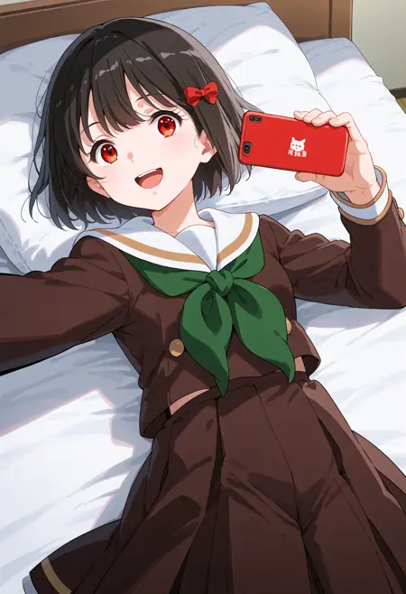 기본: h_kanade, 1girl, solo, 애니메이션 색상, 단발, 검은 머리, 빨간 머리 리본, 빨간 눈, 흰색 해군 칼라, 교복, 갈색 셔츠, 초록색 넥커치프, 긴 소매, 갈색 치마, 주름 치마,