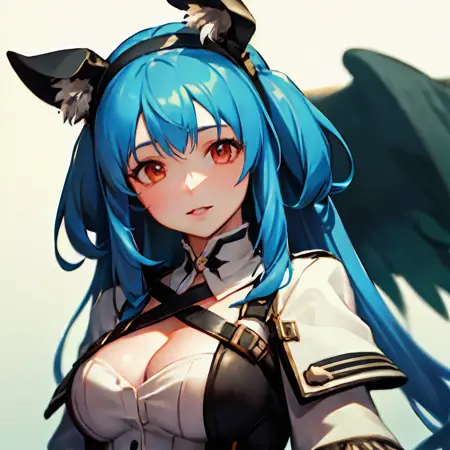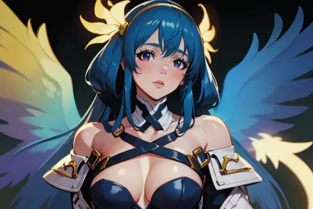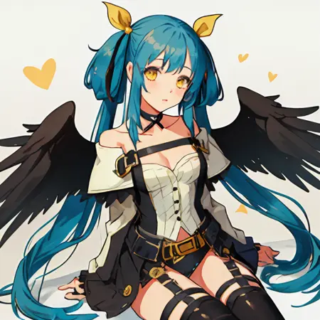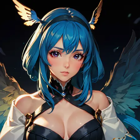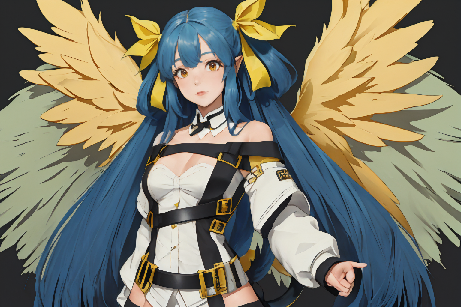 Enhanced facial features, trigger words, diji, 1Girl, blue hair, (long hair: 1.2), hair rib, rib, yellow rib, (asymmetric wings: 1.4), wings, belt, (tail: 1.1)