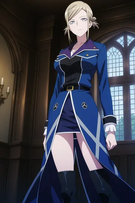 awashima seri, 短发, 金色头发, 分开的刘海, 短双马尾, 侧发, 头饰, 军装, 长袖, 白色衬衫, 蓝色外套, 长外套, 腰带, 蓝色裙子, 铅笔裙, 剑, 细剑, 剑鞘, 黑色鞋履, 大腿靴, 高跟靴