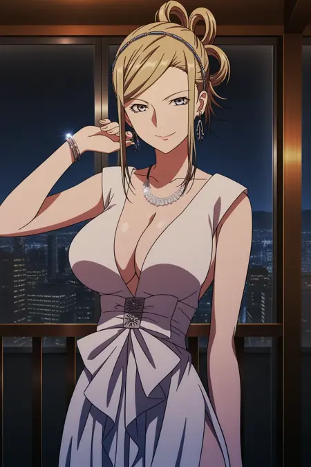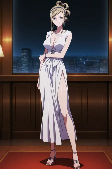 awashima seri, 短发, 金色头发, 分开的刘海, 三马尾, 发环, 侧发, 发带, 耳环, 项链, 手镯, 白色连衣裙, 长裙, 露背裙, 无袖, 侧开衩, 高跟凉鞋