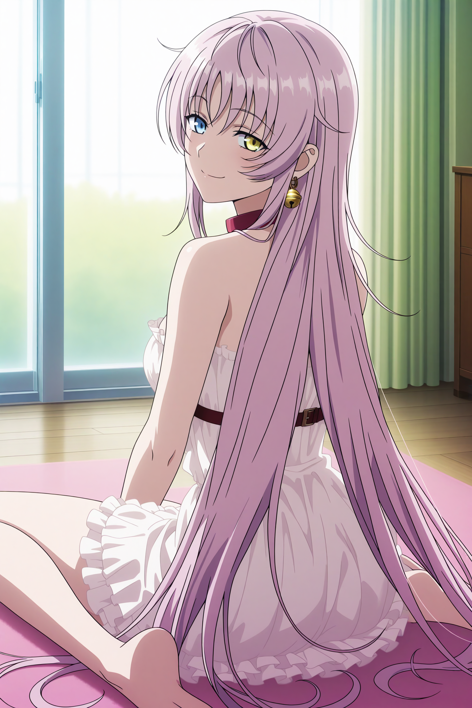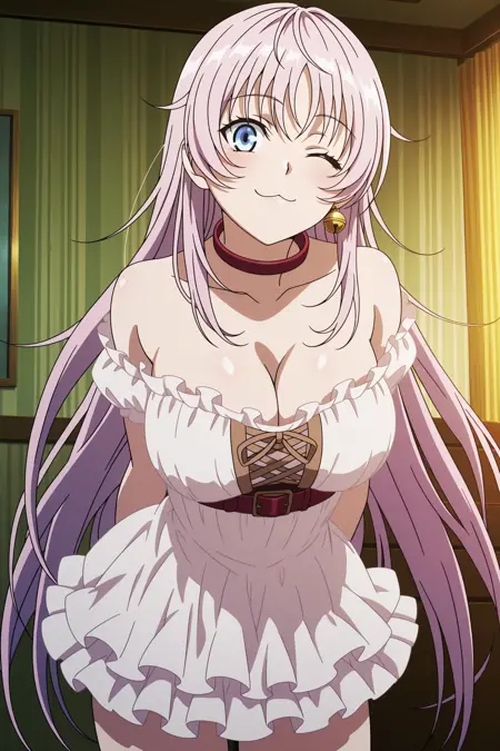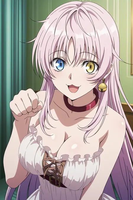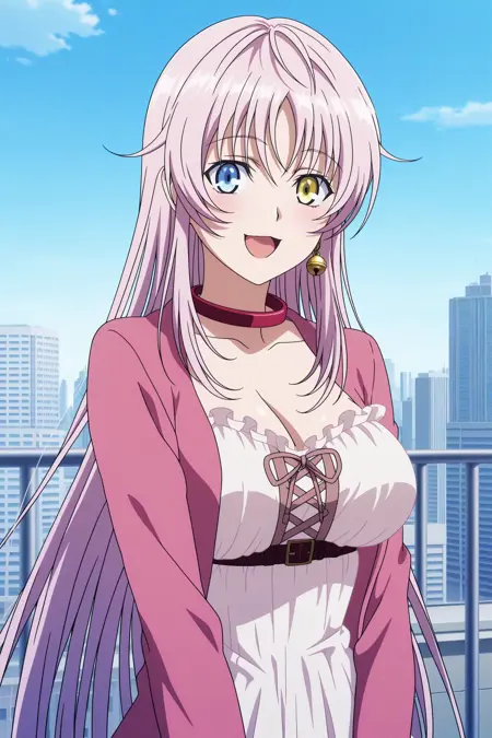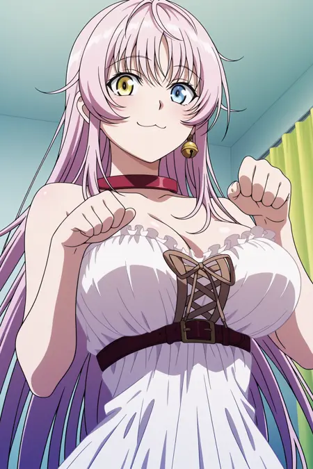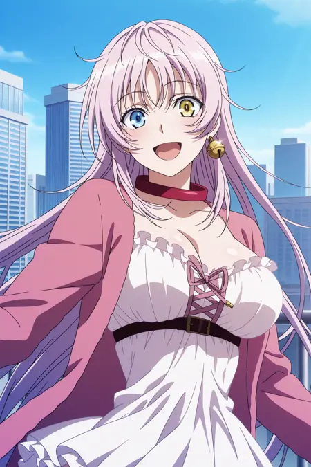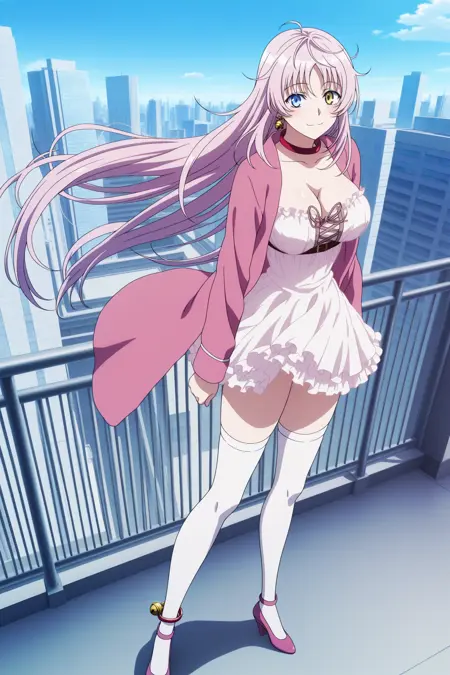 neko (k-project), 매우 긴 머리, 분홍색 머리, 사이드록, 불규칙한 앞머리, 이채색 동공, 파란 눈, 노란 눈, 종 모양 귀걸이, 빨간 목줄, 흰색 드레스, 프릴 드레스, 십자 끈 단추 옷, 가슴 벨트, 아랫가슴, 분홍색 재킷, 흰색 허벅지 스타킹. 발목줄, 분홍색 신발, 끈형 하이힐