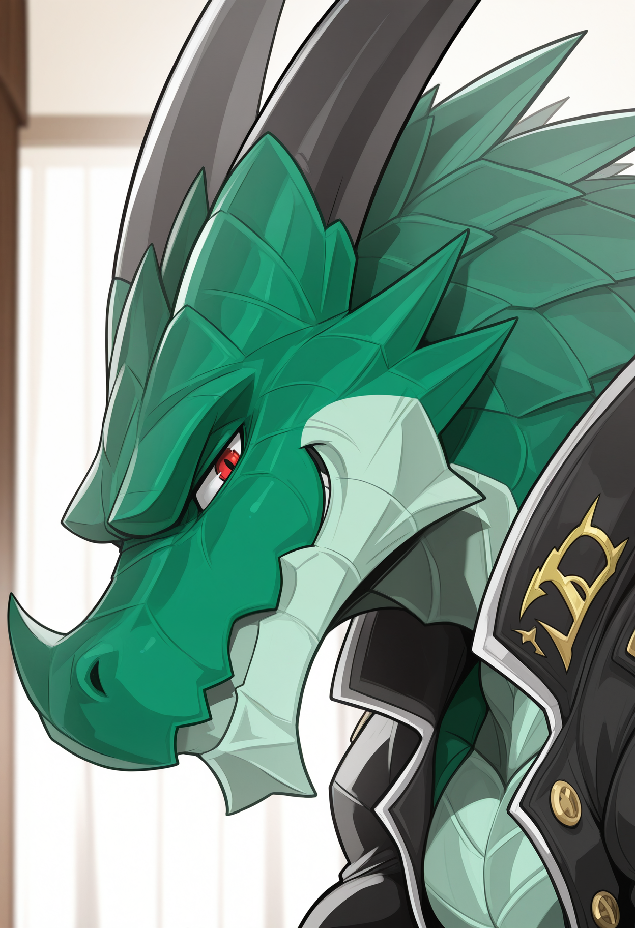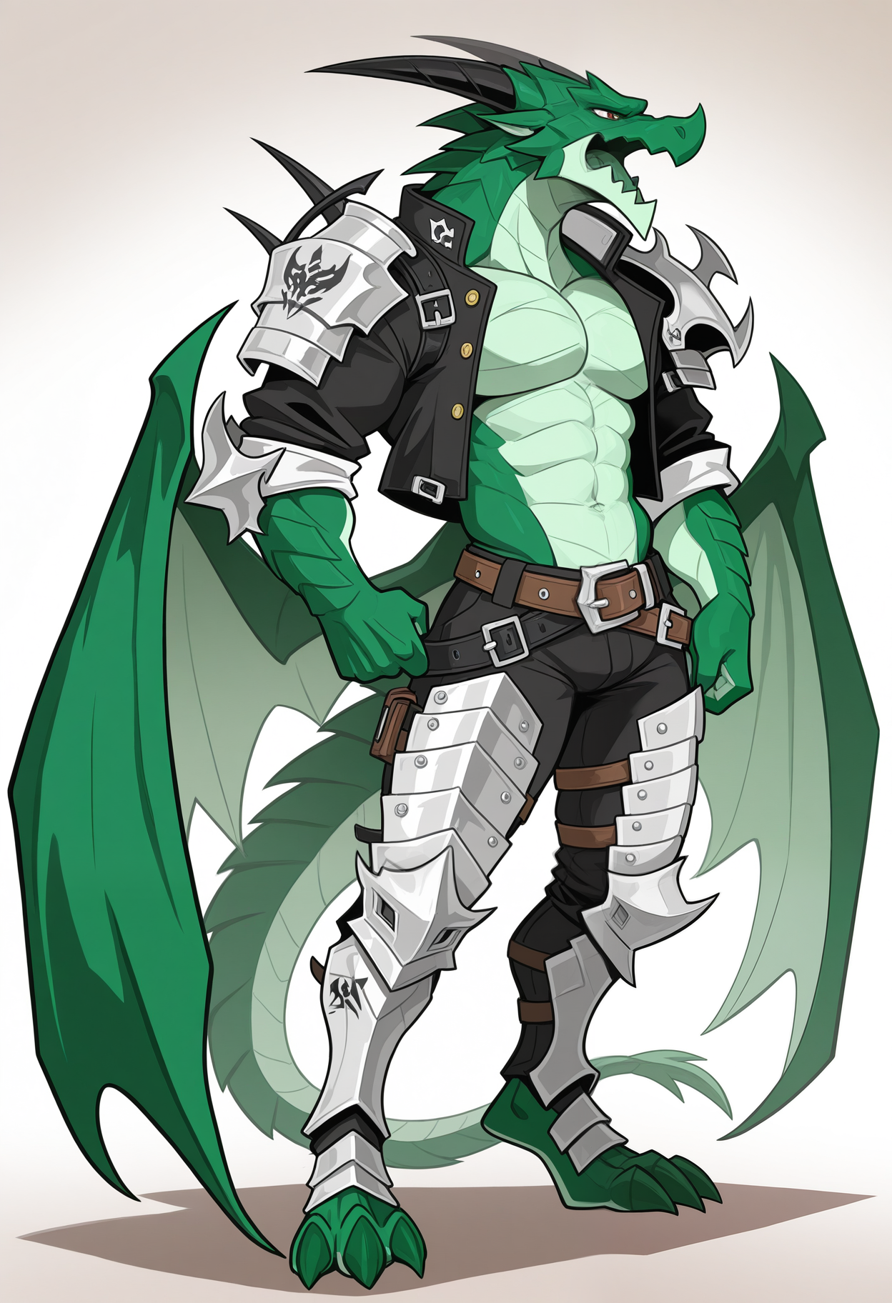 ラゴン、筋肉質な男性、ドラゴン、角、尾、鎧、ベルト、翼、緑色の肌、肩当て、金色の輪、開いたジャケット、脚の鎧、黒いパンツ、赤い目