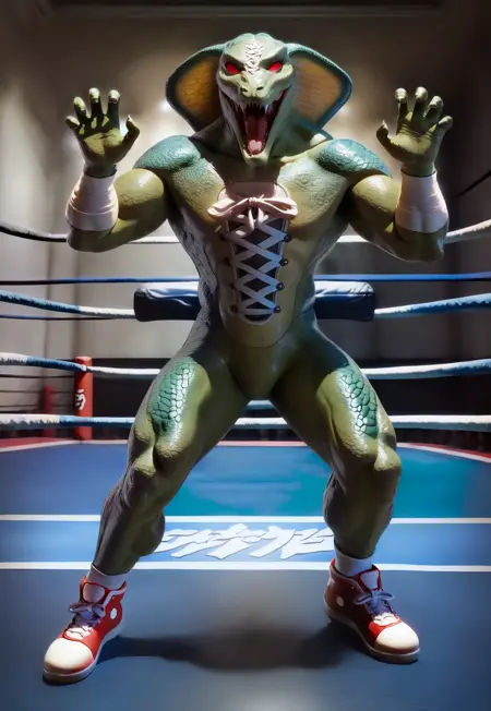 Tags: sneagator, solo, full body, 1boy, green skin, monster boy, muscular, cross-laced clothes, red eyes, no pupils, teeth, bandages, sneakers