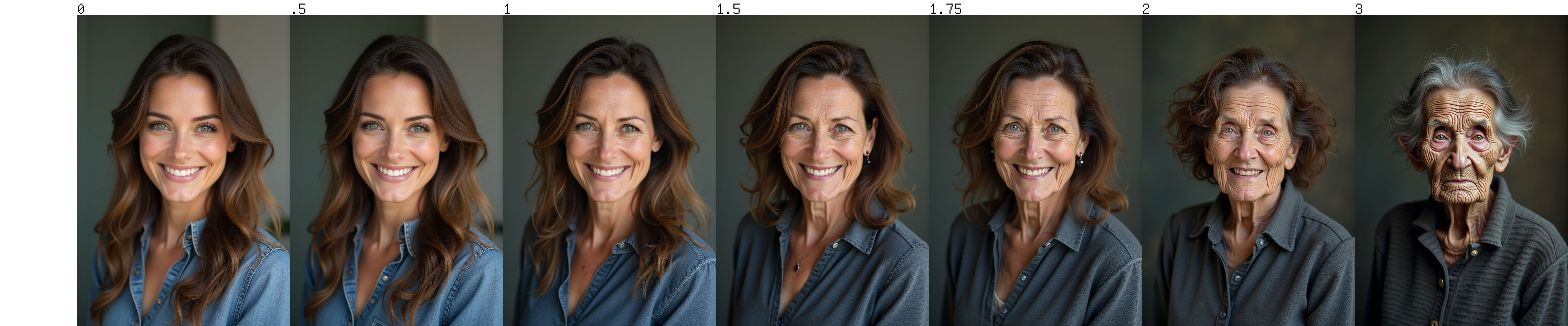 유용한 가중치 범위는 프롬프트와 해상도에 따라 달라질 수 있습니다. 일부 경우 모든 노화 효과가 0.6과 0.8 사이에서 발생하며, 다른 프롬프트의 경우 3.0 이상으로 설정해야 합니다.