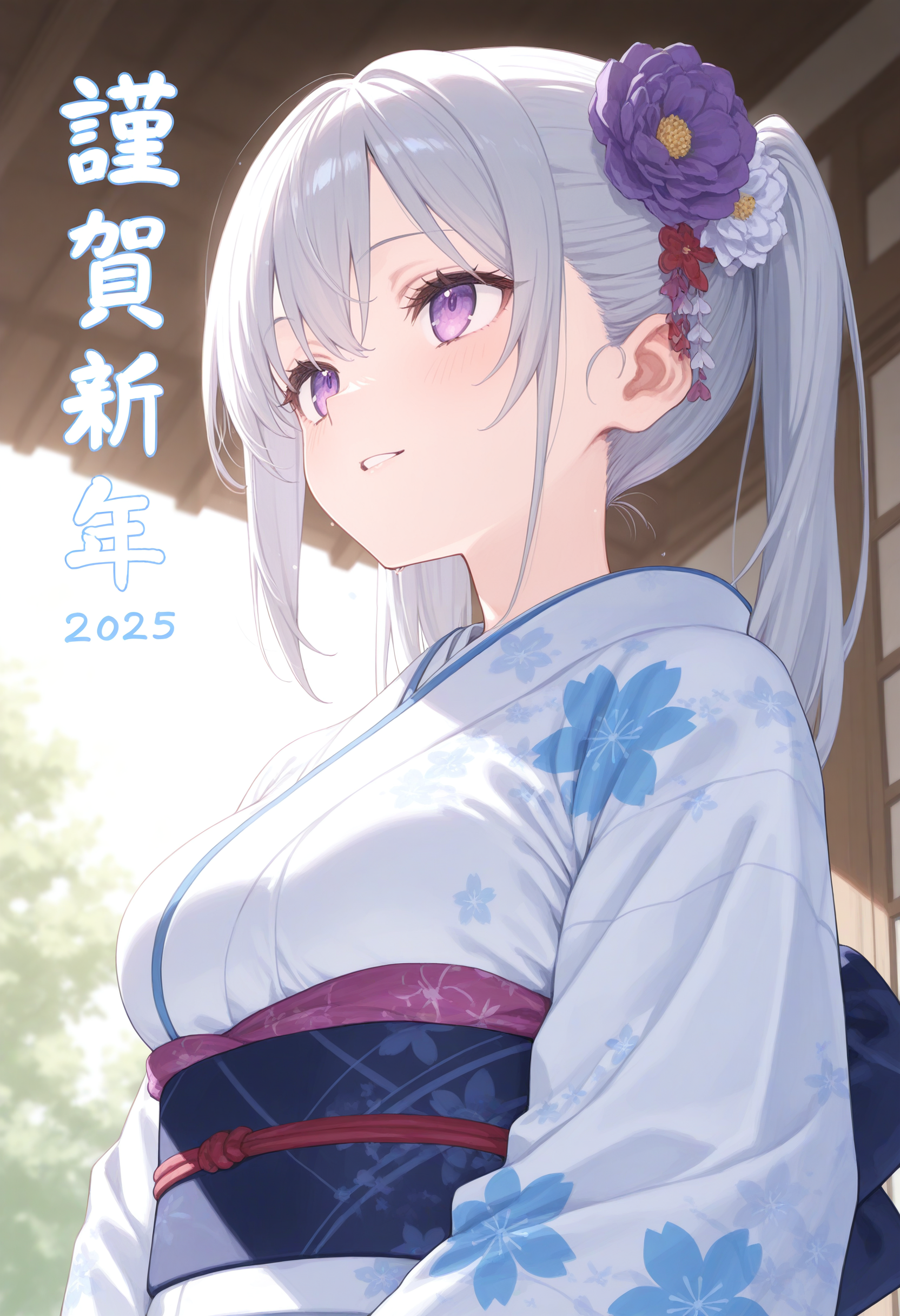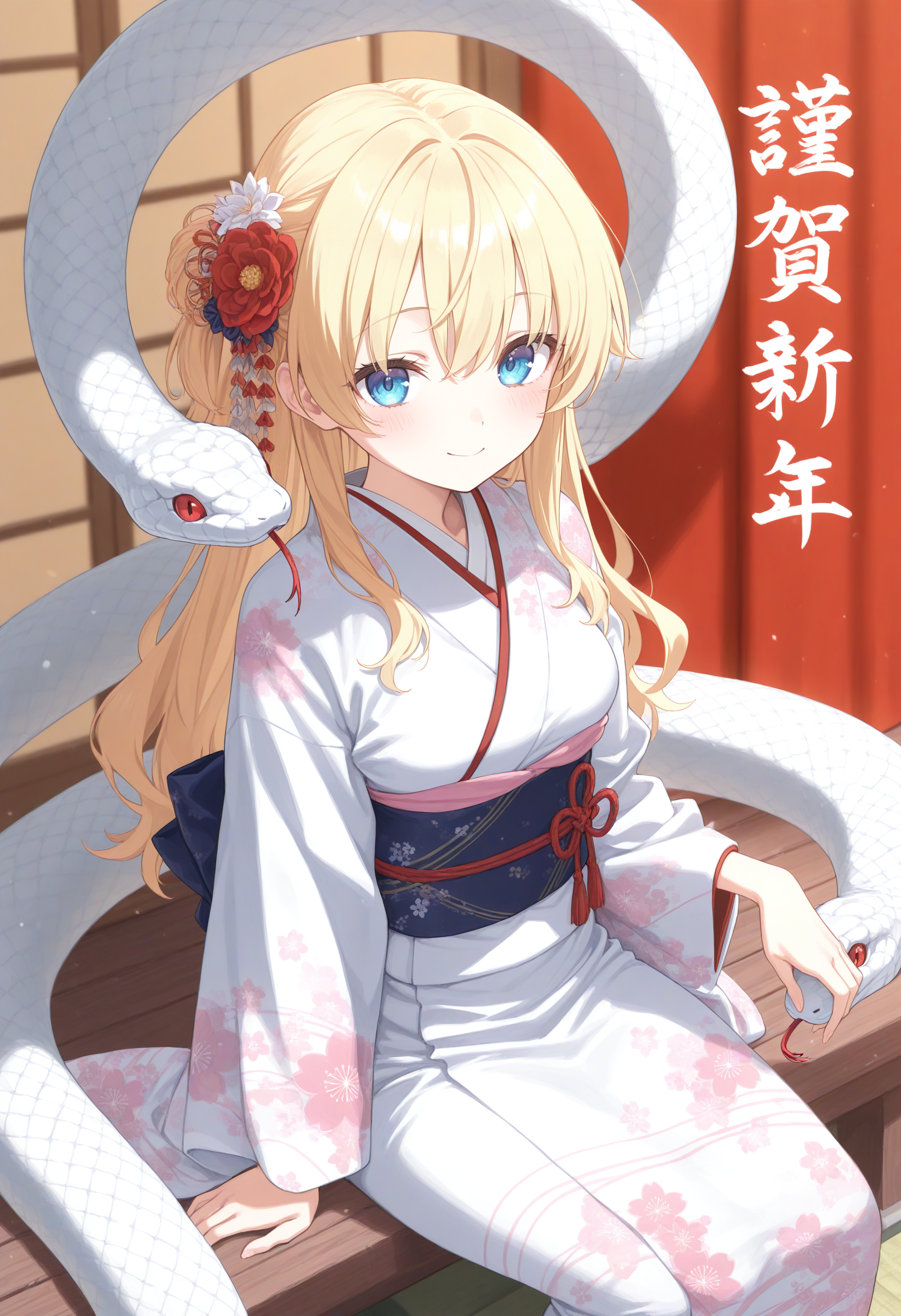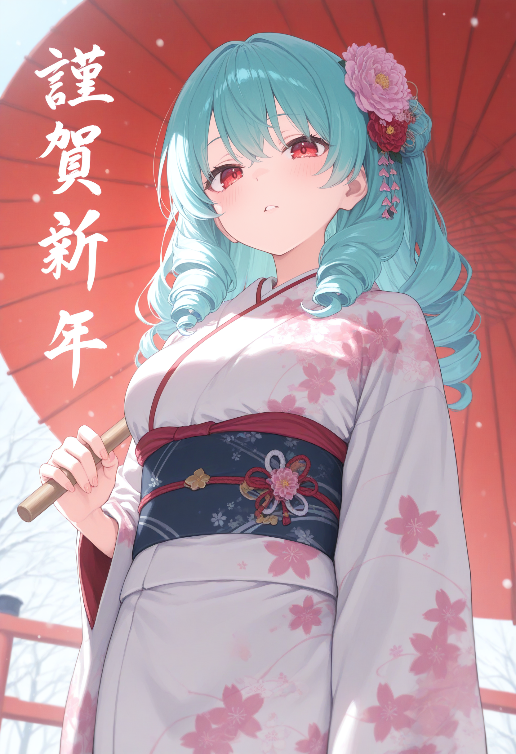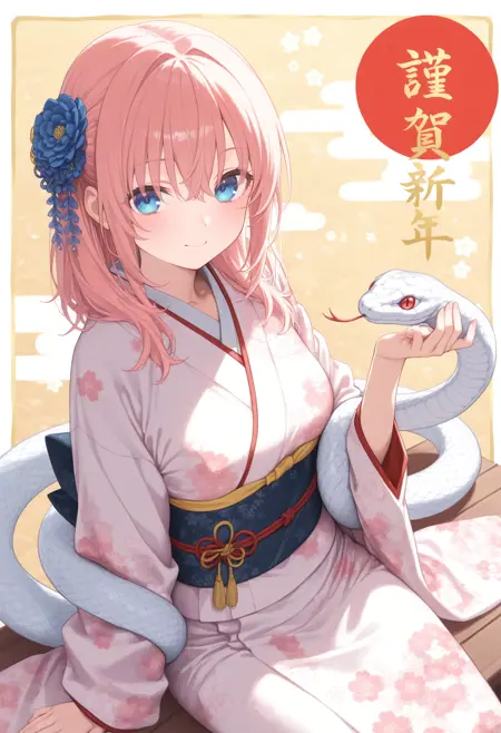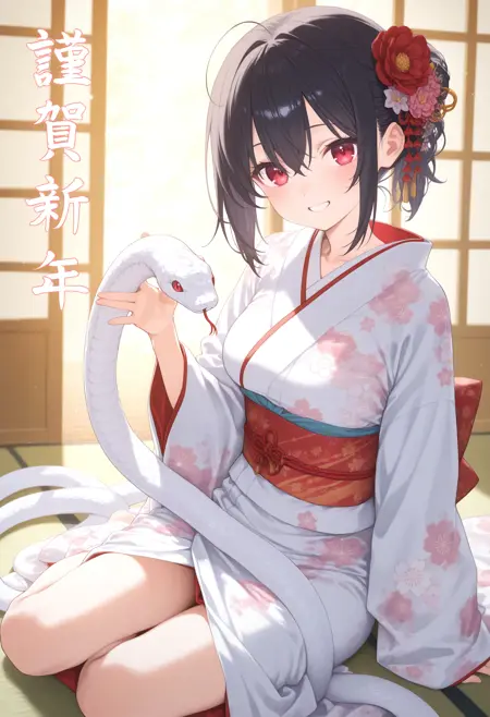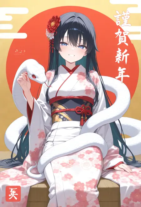 元からある程度学習されているため、文字のバリエーションを増やしたり、干支の蛇を含めたりする際に、よりダイナミックな蛇を生成しやすくなります。年賀状の絵柄は多様なパターンがあるため、他の追加すべきプロンプトについてはサンプルをご覧ください。文字がうまく出ない場合は、ネガティブプロンプトやマージモデルとの相性が影響している可能性があります。
