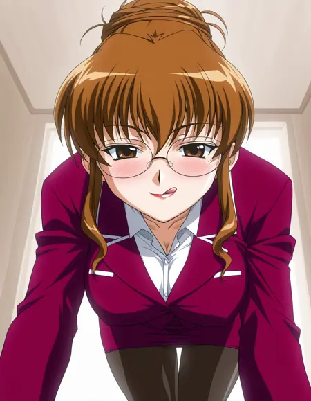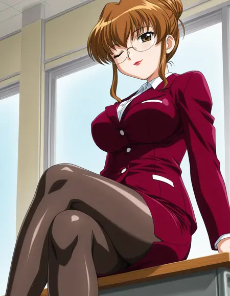 shikijo saori, brown hair, single hair bun, brown eyes, glasses, lipstick, business suit, red clothing, pencil skirt, black pantyhose