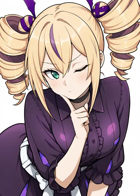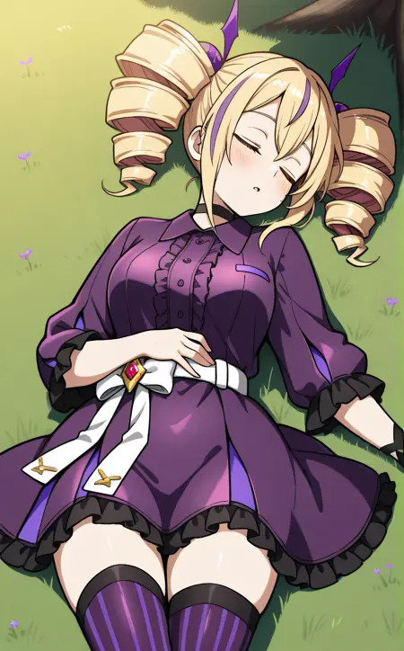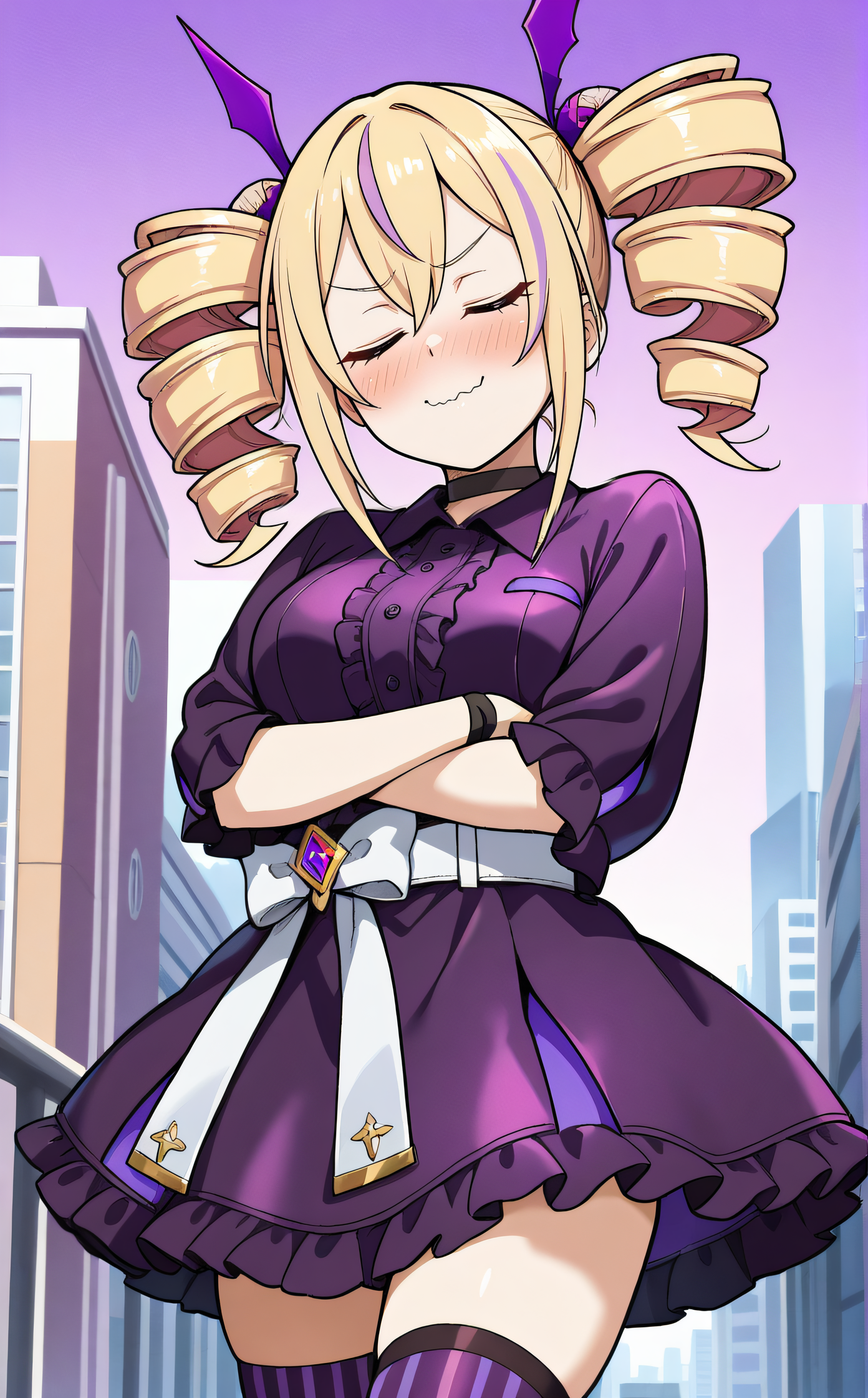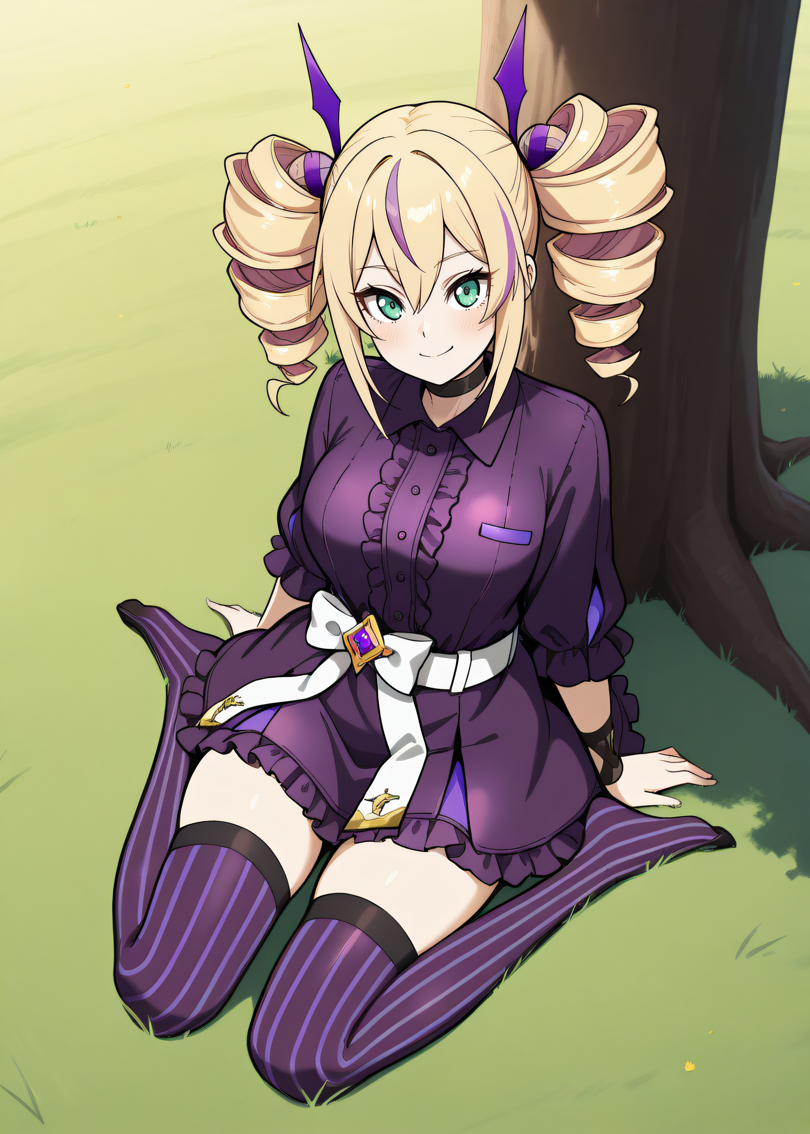 violet, streaked hair, twindrills, black choker, white belt, white bow around waist, collared dress, black frilled dress, purple vertical-striped thighhighs, black lace-up boots