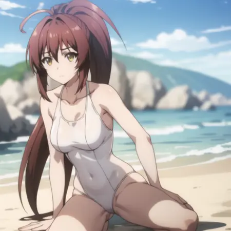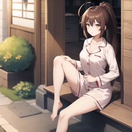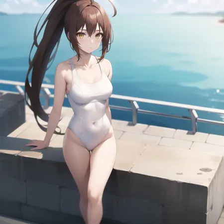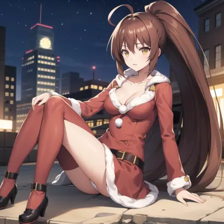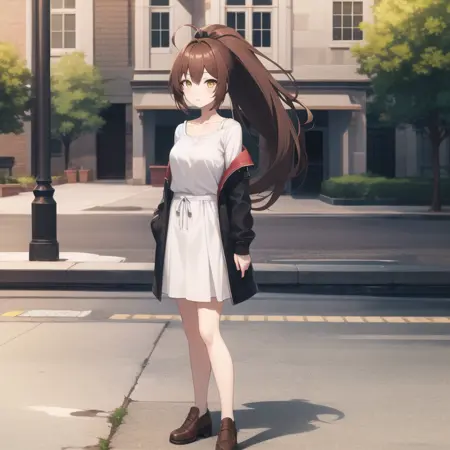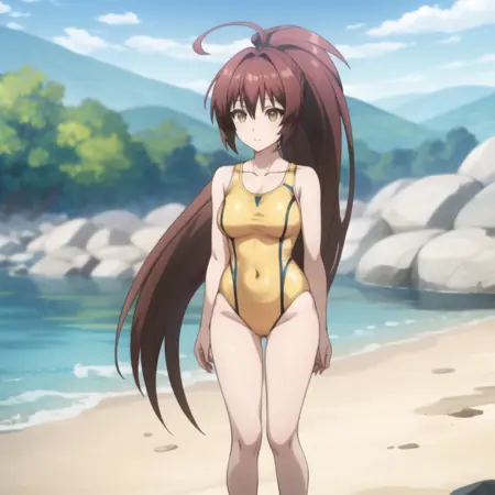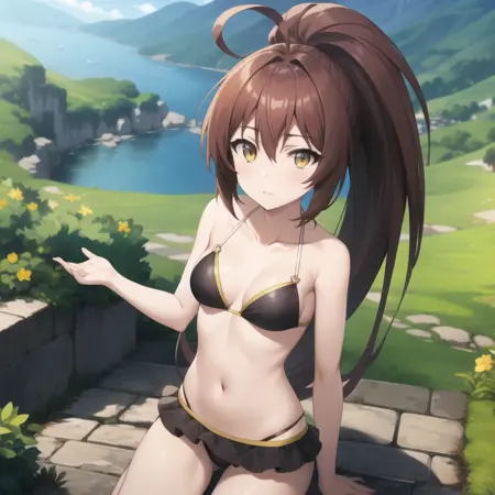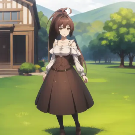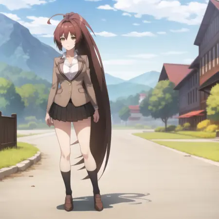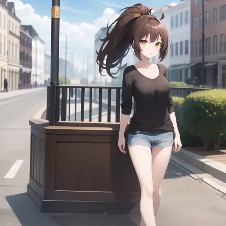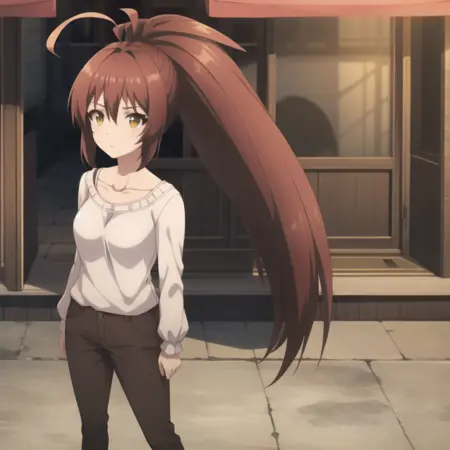 トリガー語: icm-rin、長い髪、茶色の髪、ポニーテール、青い目、あほ毛、黄色のシャツ、茶色のコルセット、短いパンツ、青いマント