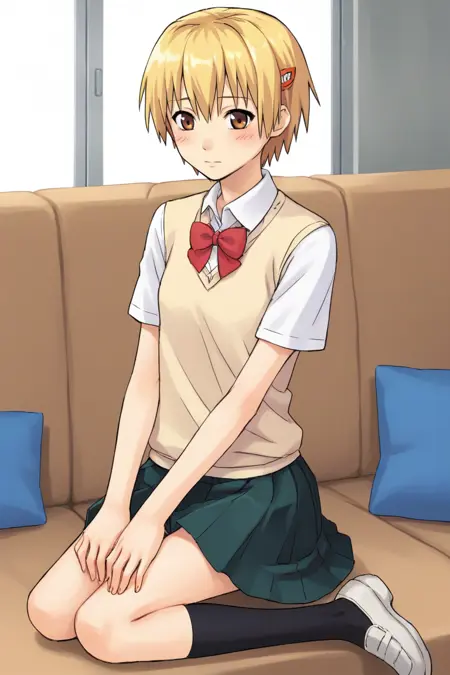 yako1, ブロンドの髪, 茶色の目, 短い髪, 髪飾り, ヘアクリップ, リボン, ボウタイ, 学校の制服, スカート, ベスト, ネイキーハイズ, 靴,