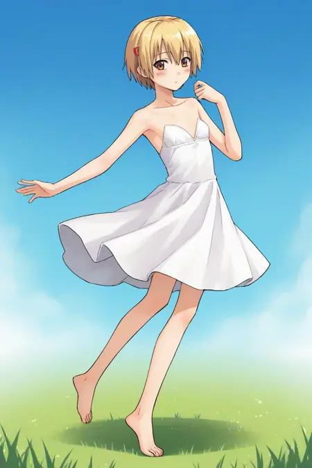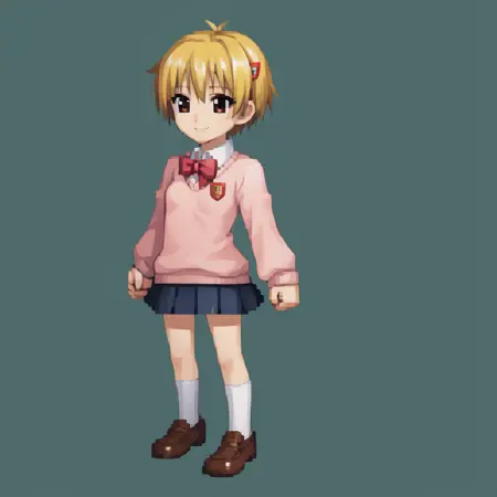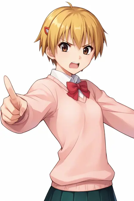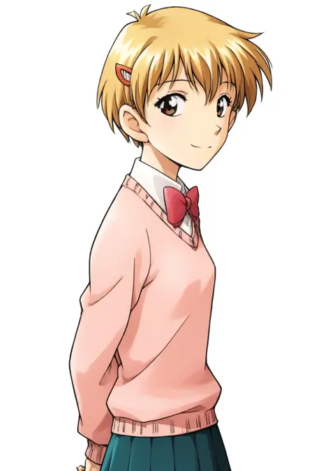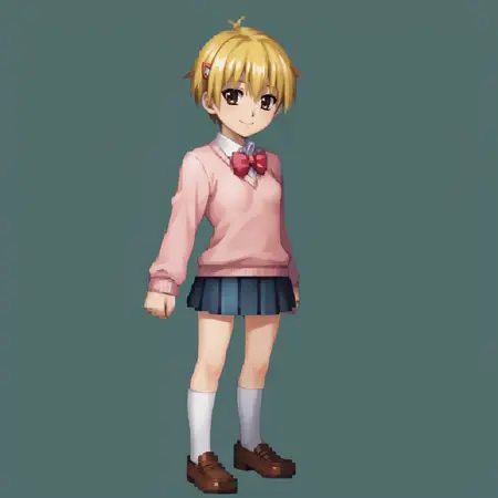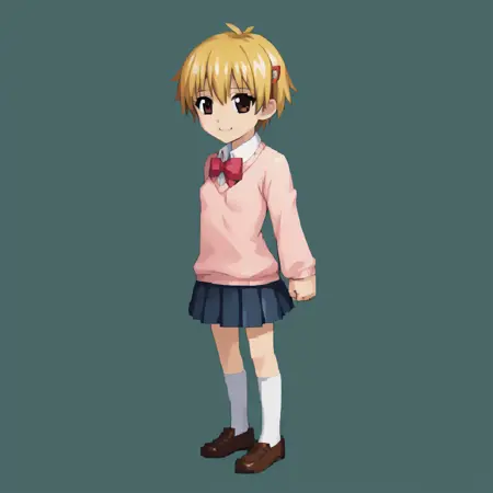 yako1, ブロンドの髪, 茶色の目, 短い髪, 髪飾り, ヘアクリップ, リボン, ボウタイ, 学校の制服, スカート, セーター, ネイキーハイズ, 靴,