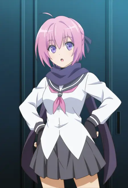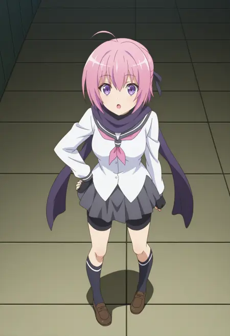 - 보라색 스카프, 흰색 셔츠, 회색 치마, 로퍼, 손가락 없는 장갑, 학교 유니폼, 양말, 치마 아래 단 Shorts, 갈색 신발, 검은 장갑, 주름 치마, 자전거용 단 Shorts,