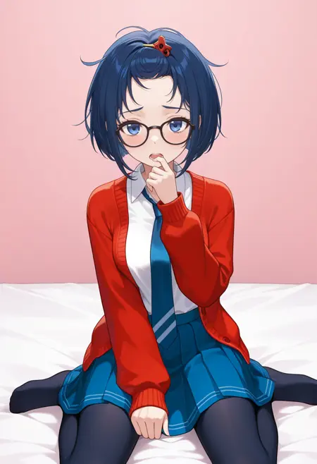 파란 넥타이, 검은 프레임 안경, 흰 셔츠, 파란 치마, 긴 소매, 주름 치마, 오픈 카디건, 빨간 카디건, 진한 파란 스타킹,