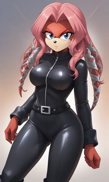 Lien-Da the Echidna, red skin, pink hair, dark blue eyes, black nose, black leather bodysuit, belt, black boots