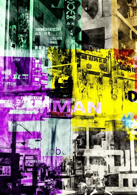 Mixed-Media Effects: Merges photographic realism with abstract graphics and collage.