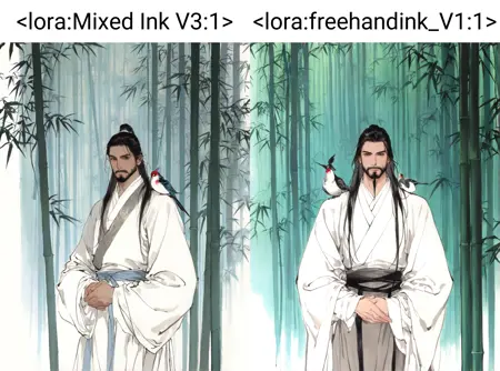 • 通过调整chinese ink styletraditional mediacolor ink (medium)ink (medium)等关键词权重,可产出不同类型的半写意风格。