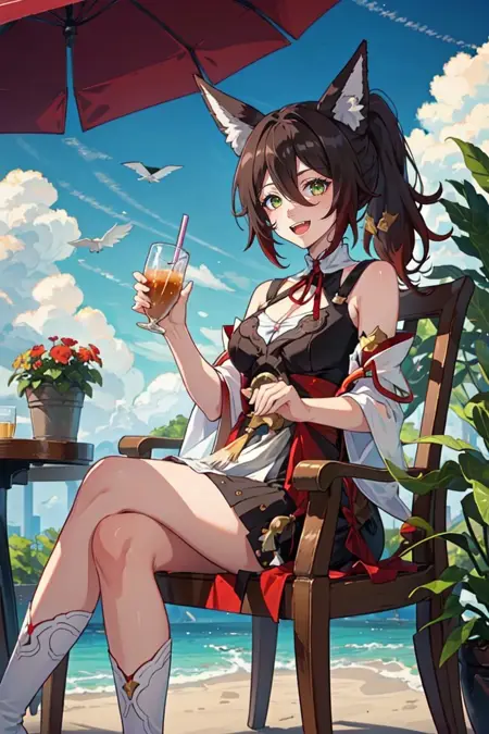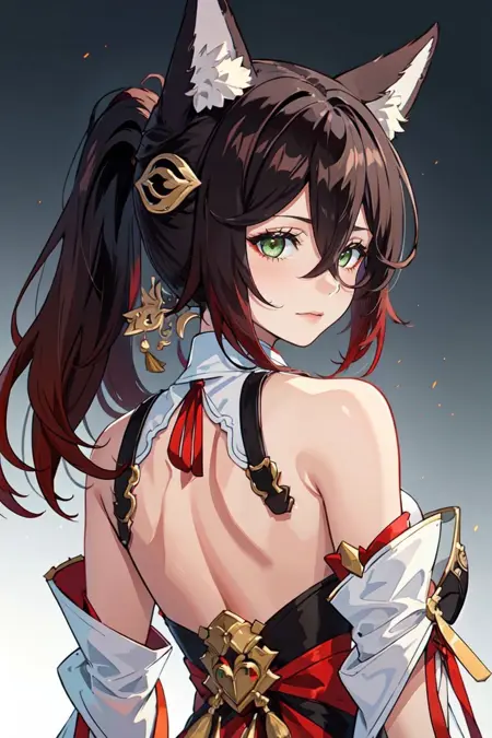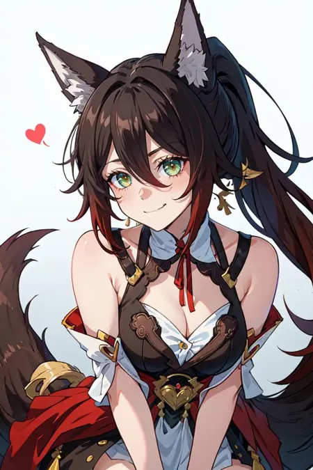 • For a basic start use the tags: pikkytingyun, 1girl, solo, looking at viewer, brown hair, red hair, gradient hair, hair between eyes, bangs, long hair, ponytail, green eyes, breasts, large breasts, tail, animal ears, fox ears, fox tail, animal ear fluff, fox girl, detached sleeves, jewelry, bracelet, smile, :d