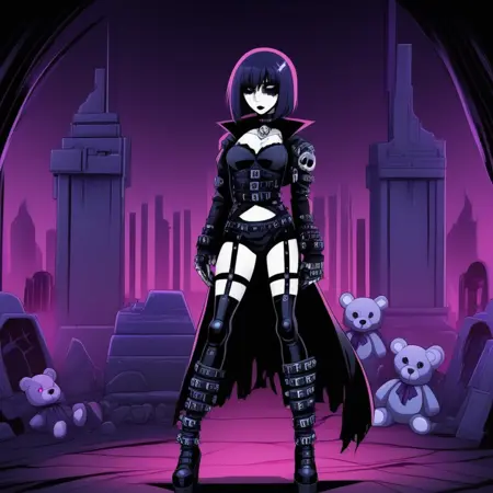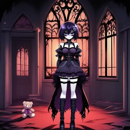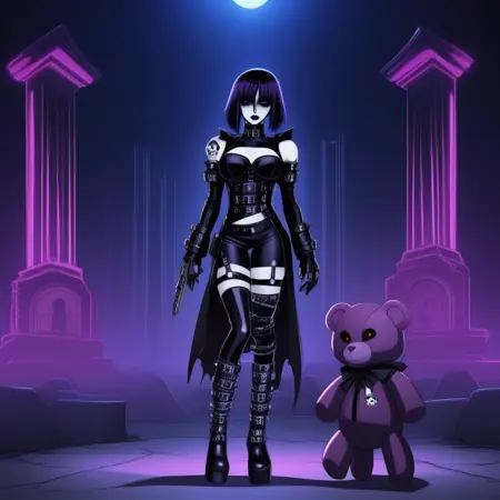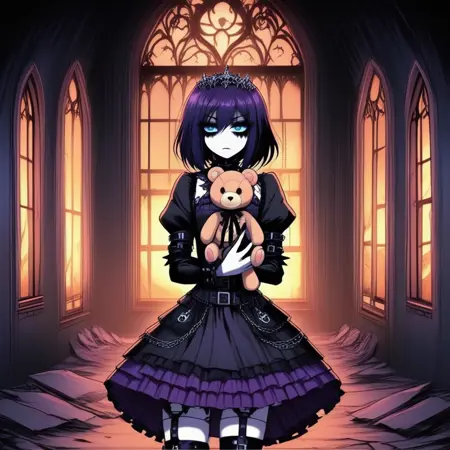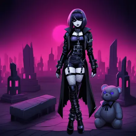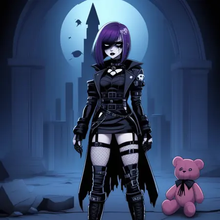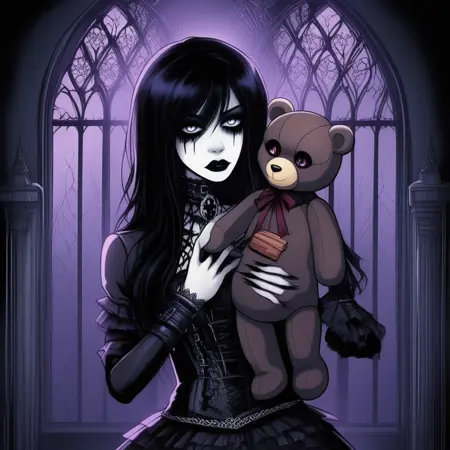 고딕 스타일 캐릭터. 고티히크와 그녀의 테디. 이 둘은 특별한 관계를 맺고 있습니다. 그들은 대부분의 시간을 함께 보내는 것을 좋아합니다. 이 캐릭터는 제가 만든 것입니다. 저는 정말 멋진 것 같아요. 어떻게 생각하세요? SDXL1.0 버전.
