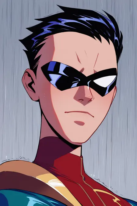 Robin - rbn, solo, black hair, 1boy, red shirt, green sleeves, short sleeves, mask, superhero, domino mask,
