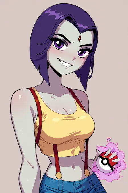 Raven - rvn, 1girl, raven (dc), purple hair, short hair, purple eyes, grey skin, forehead jewel,