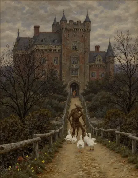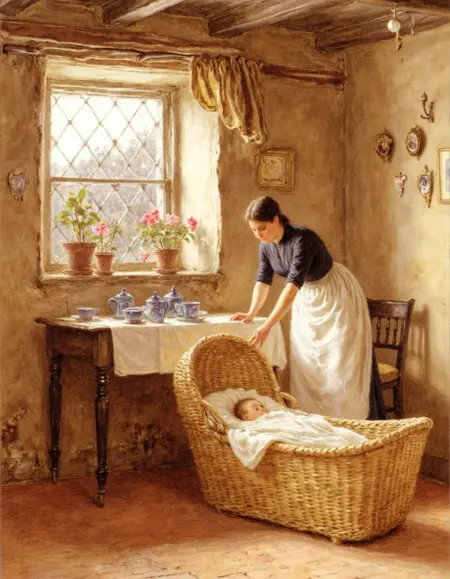 • 白と青のドレスを着た穏やかな女性が、アイビーに覆われた赤煉瓦でできた茅葺き屋根の小屋の開かれた入り口そばに立っている。周囲は白とピンクのバラと野の花で満たされた豊かな庭、簡素な木製の門と石畳の道が入り口へと続いている。色調は、土色の茶、豊かな緑、パステル調の花々が豊かに含まれた Helen Allingham 風の Cottage Core ペインティング