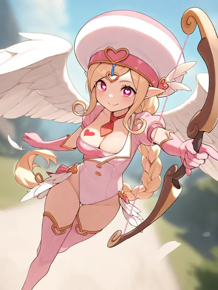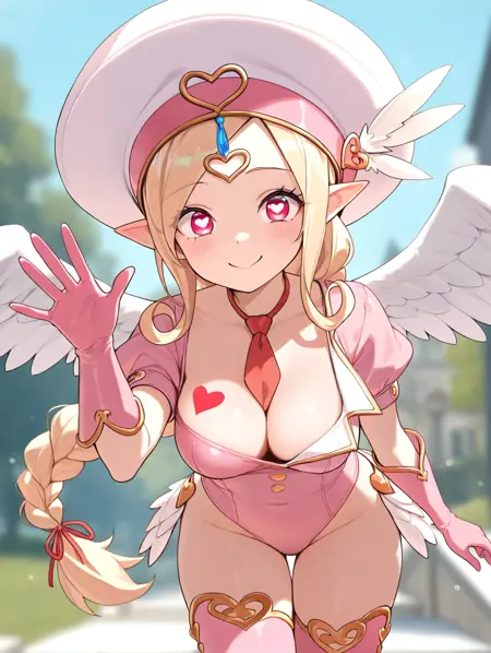 큐피드, 금발, 긴 측면 머리카락, 분홍색 눈, 심장 모양 동공, 뾰족한 귀, 날개, 긴 머리, 단일 땋은 머리, 가슴에 심장 문신, 모자, 모자에 하얀 깃털, 분홍색 레오타드, 가슴 노출, 짧은 소매, 분홍색 허벅지 양말, 분홍색 장갑, 빨간 넥타이, 보석, 분홍색 프릴