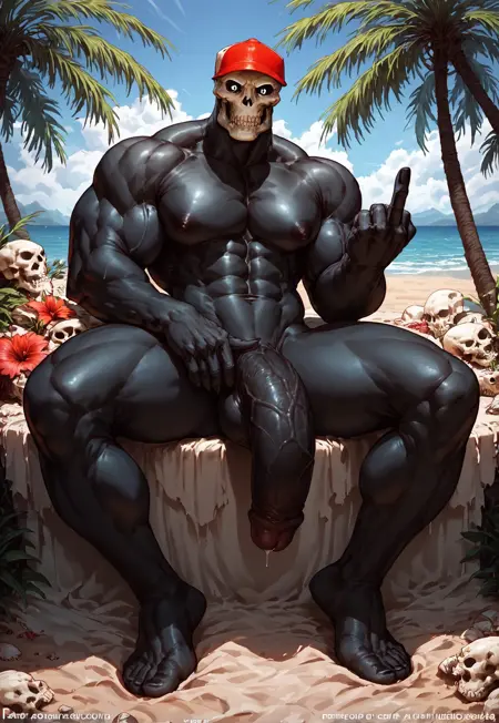 Skullmageddon, skull head, white pupils, black skin, red baseball cap