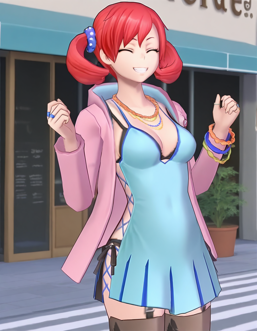 옷: 목걸이, 팔찌, 반지, 계층적 옷차림, 분홍 재킷, 열린 재킷, 후드 재킷, 파란 드레스, 클라비컬, 레이스 트림, 측면이 없는 옷, 십자 끈 슬릿, 가슴, 검은 브라, 레이스 트림 브라, 검은 팬티, 측면 매듭 팬티, 스트랩, 허벅지 양말, 프린트 허벅지 양말