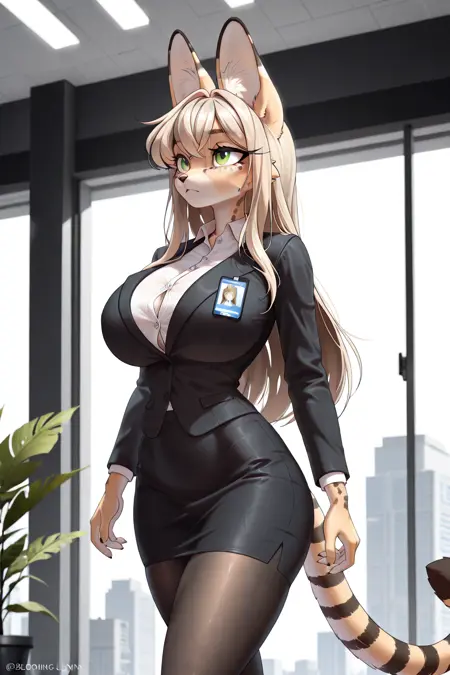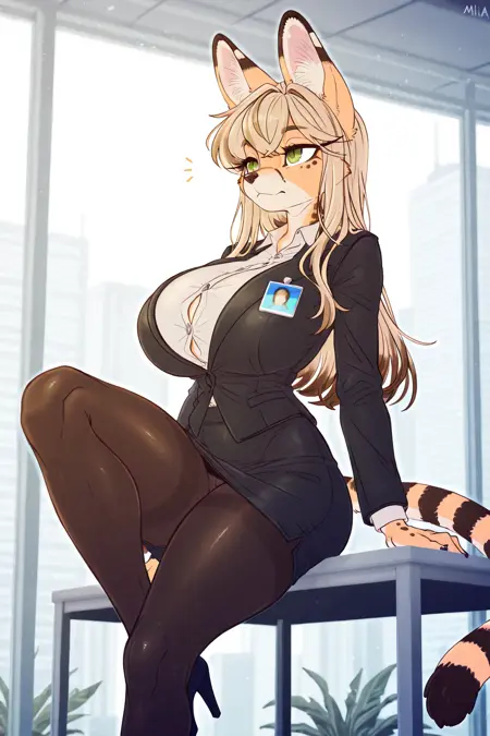 トリガー: Mila、アンスロ、セヴァル、金髪、緑色の目、長いまつ毛、大きな胸、長い髪、前髪、ペンシルスカート、パントストッキング、シャツ、ハイヒール、スーツジャケット、IDバッジ、IDカード