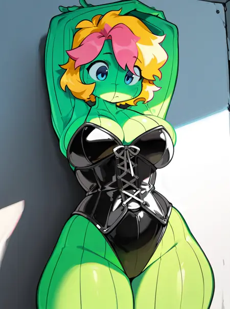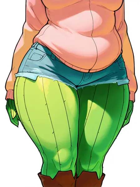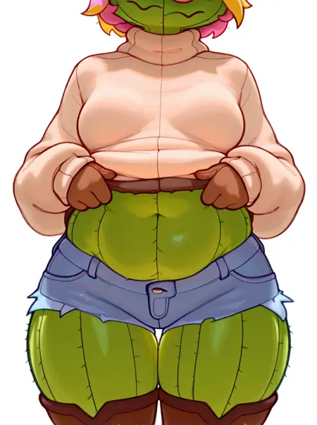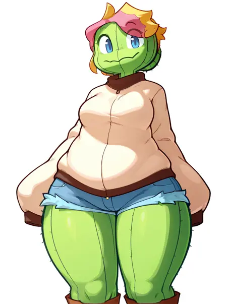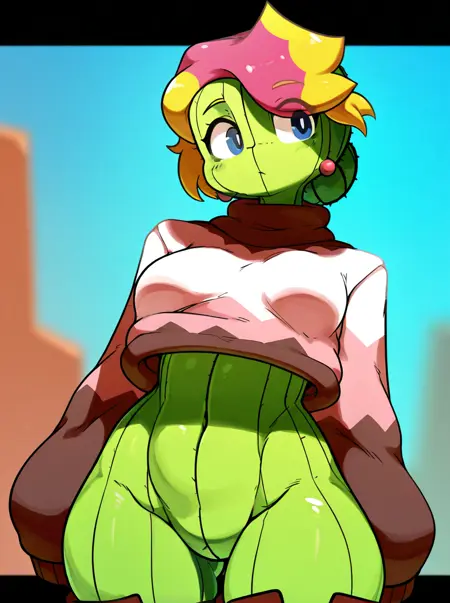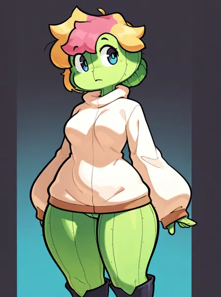 트리거: 캅티갈, 식물 및 동물, 식물형 인간, 선인장형 인간, 앤트로, 여성, 녹색 몸체, 두꺼운 허벅지, 넓은 골반, 짧은 머리, 금발, 분홍색 머리, 다색 머리, 파란 눈, 단색 몸체, 특징 없는 가슴, 특징 없는 생식기, 과도하게 큰 스웨터, 부츠, 약간 통통한 체형