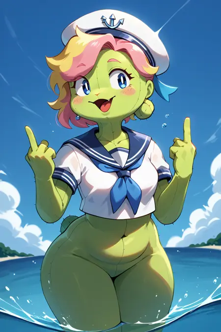 Triggers: Cactigal, flora fauna, plant humanoid, cactus humanoid, anthro, female, green body, thick thighs, wide hips, short hair, blonde hair, pink hair, multicolored hair, blue eyes, monotone body, featureless breasts, featureless crotch, oversized sweater, boots, slightly chubby