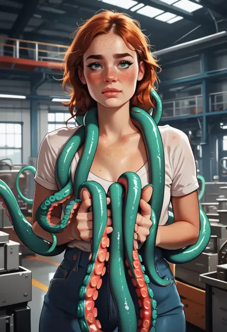 想象一个光线昏暗的工厂,背景中机器低沉的嗡鸣声不断。在老旧生锈的设备和成堆的纸箱之间,出现了一幕诡异的景象——一只长着蠕动触手的绿色黏液生物。