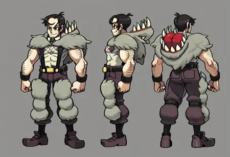 无需额外服装提示即可较好生成默认服装,但有时可能难以准确描绘背部狼皮的嘴部细节。