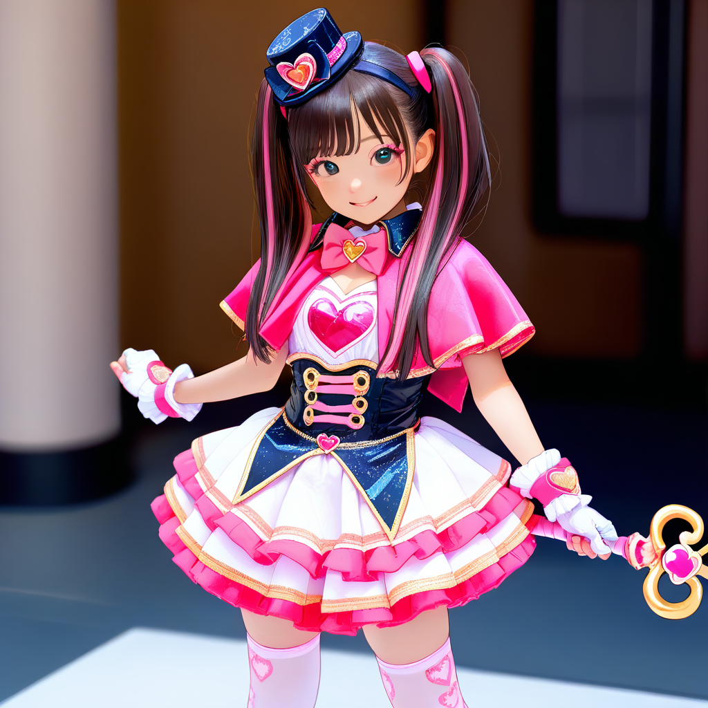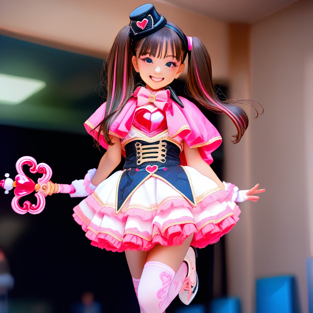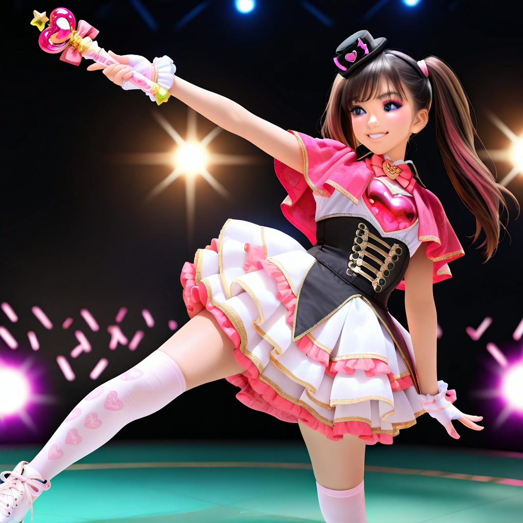 dress,mini hat,capelet,heart,bow,idol clothes,pink bow,black headwear,bowtie,mini top hat,pink_capelet,pink bowtie,wand,wrist cuffs,fingerless gloves,white gloves,corset,top hat,cosplay,frills,skirt,white skirt,frilled dress,layered skirt,pink thighhighs,white thighhighs,print thighhighs,thighhighs,shoelaces,shoes