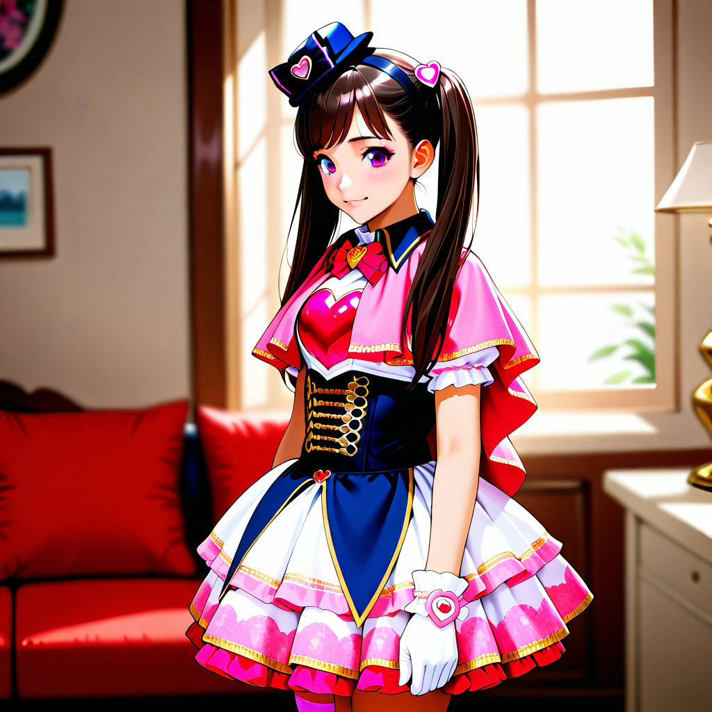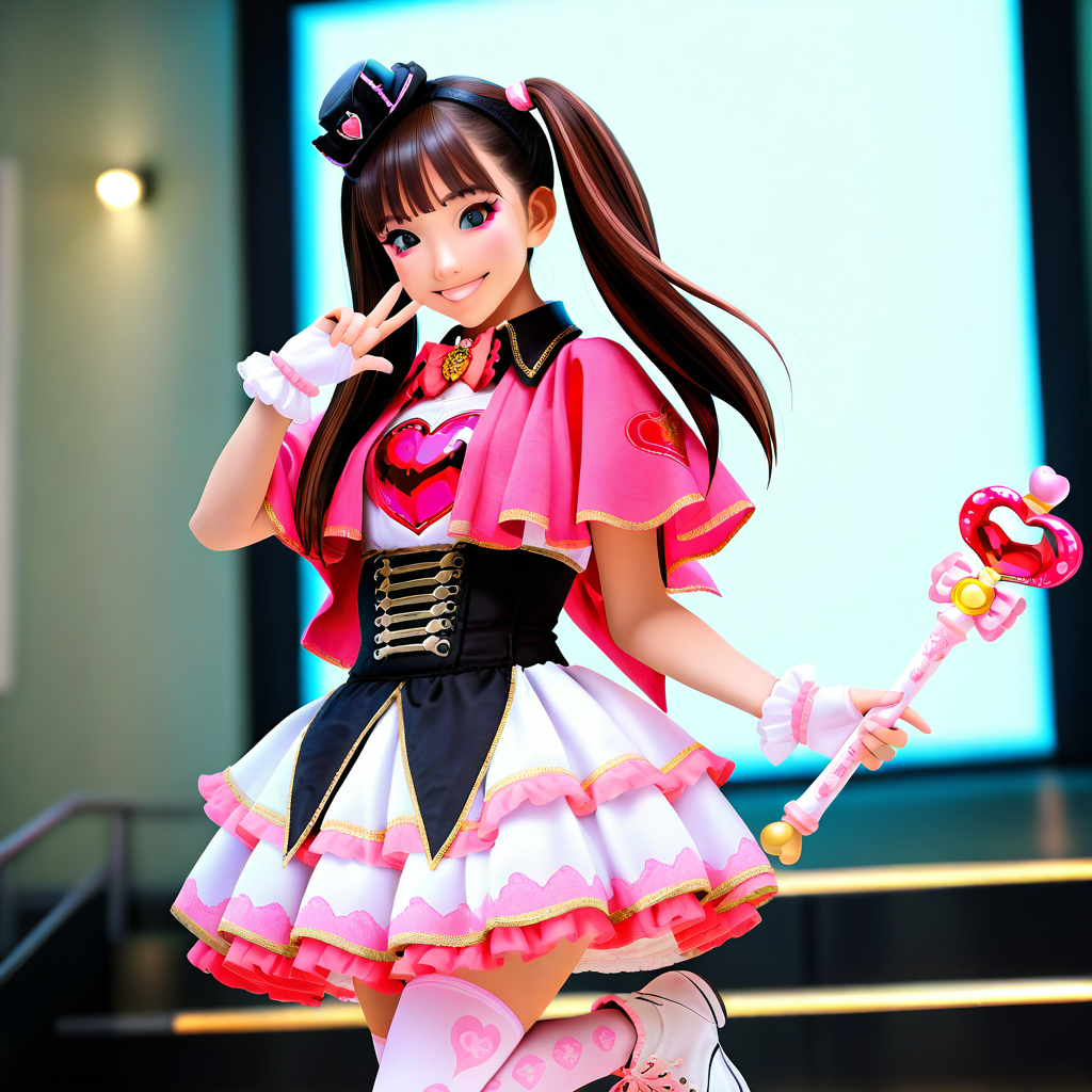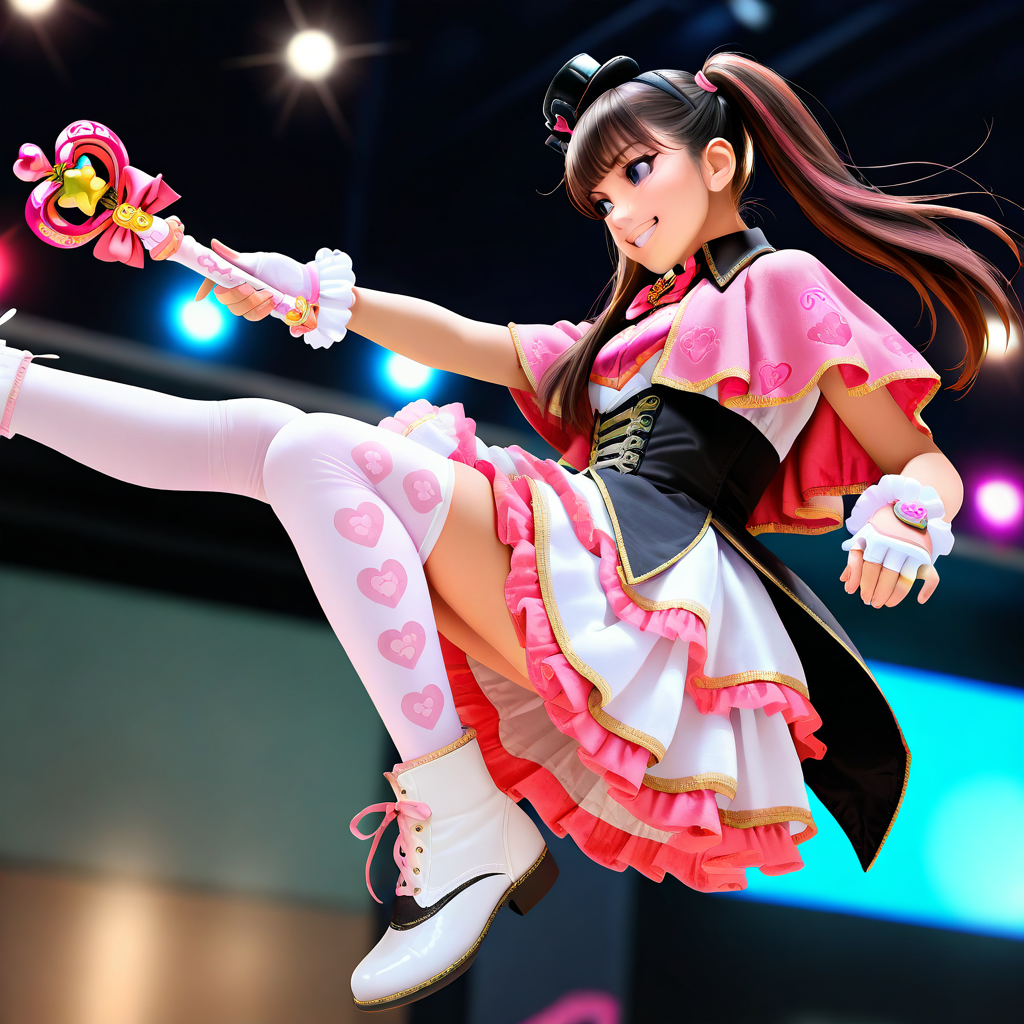 dress,mini hat,capelet,heart,bow,idol clothes,pink bow,black headwear,bowtie,mini top hat,pink_capelet,pink bowtie,wand,wrist cuffs,fingerless gloves,white gloves,corset,top hat,cosplay,frills,skirt,white skirt,frilled dress,layered skirt,pink thighhighs,white thighhighs,print thighhighs,thighhighs,shoelaces,shoes