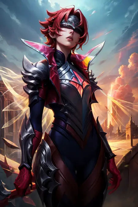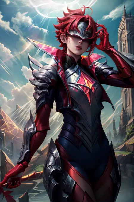 通常形態:broken covenant riven, 1girl, 目を隠している, ジャケット, アーマー, 短髪, 赤髪