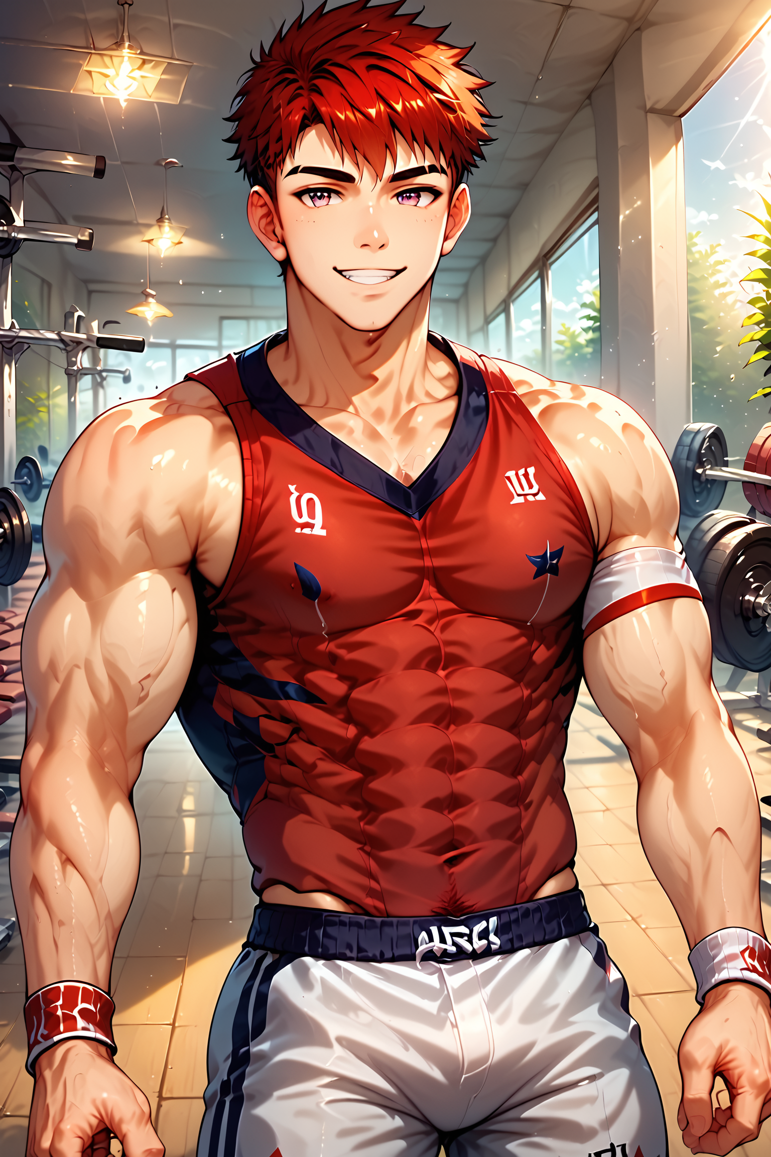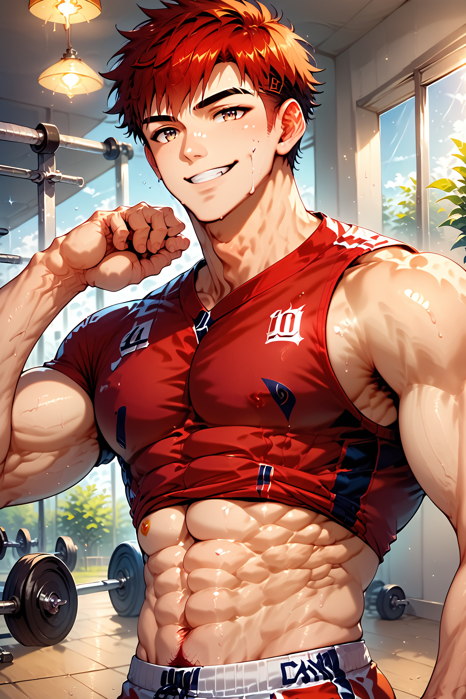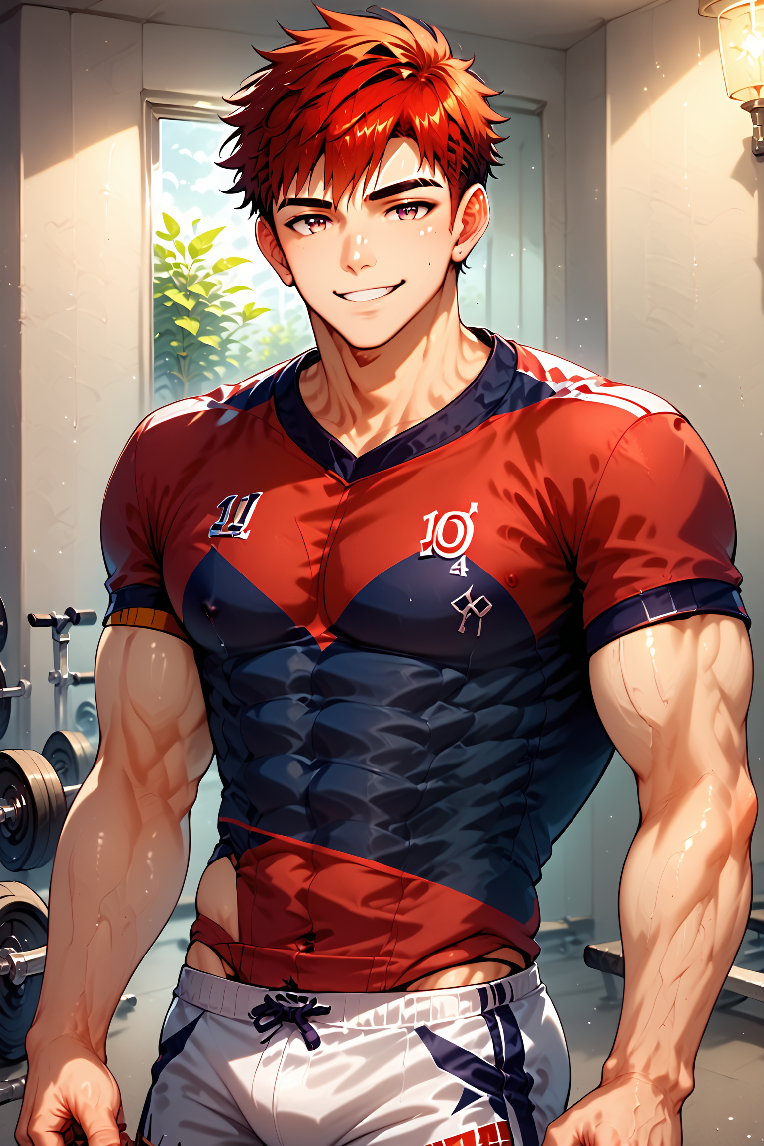 derek、1boy、男性焦点、ソロ、筋肉質、筋肉質な男性、スポーツウェア、全身、胸筋、ヘルメット、ぴったりした、ボール、白い短パン、短髪、短パン、ズボン、赤いシャツ、靴、