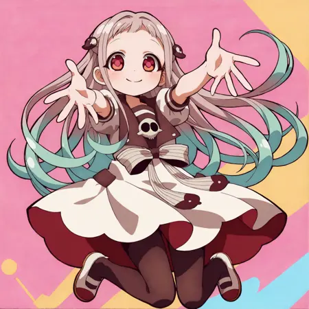 NeneYashiro, child, long hair, looking at viewer, white hair, red eyes, multicolored hair, gradient hair, hair ornament, dress, ribbon, skull ornament, short sleeves, puffy sleeves, sailor collar, white dress, black pantyhose, pantyhose, shoes, white footwear,