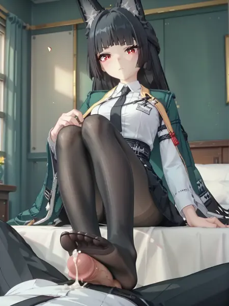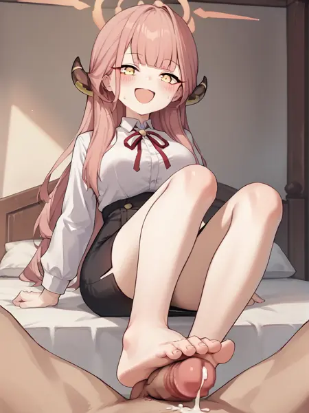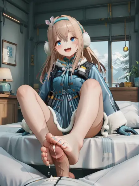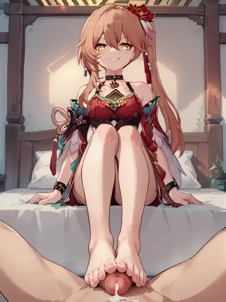 ashikokistep, 1girl, bed, sitting, penis, stepped on,