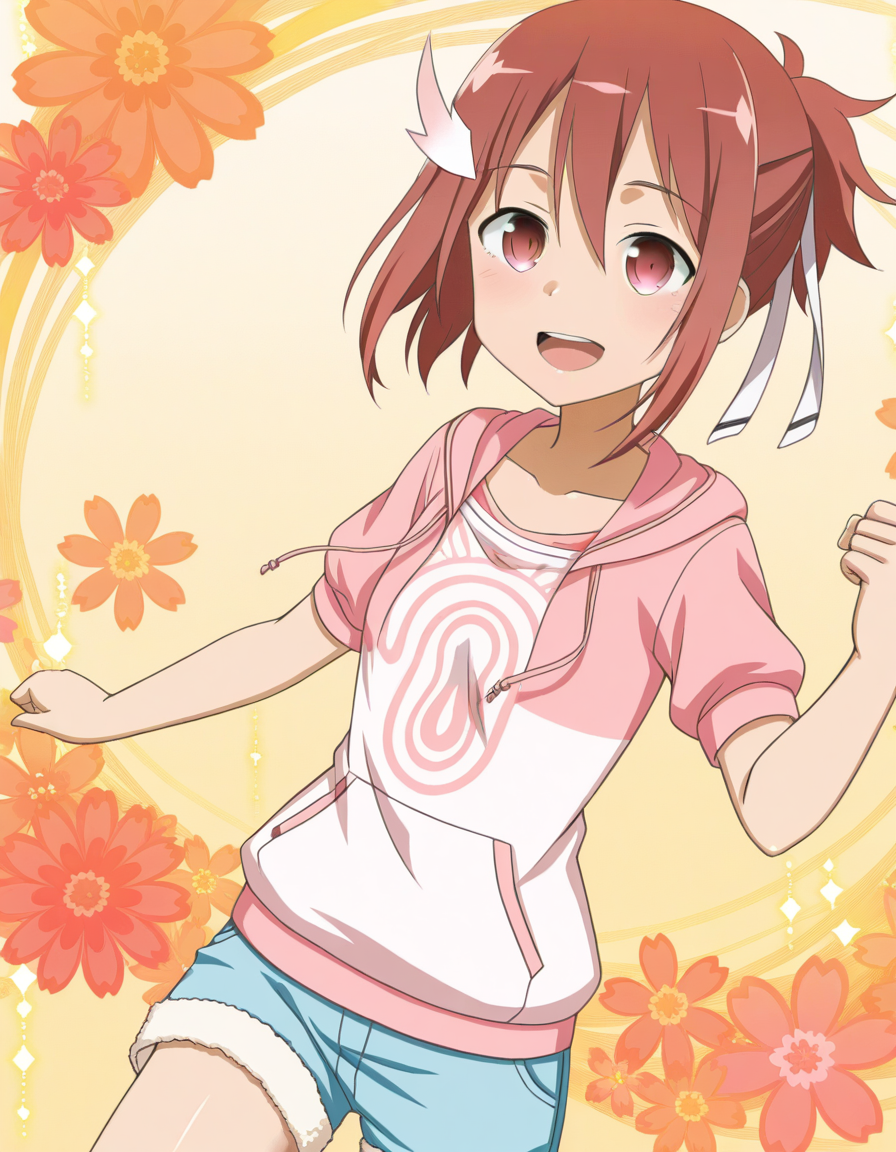 lora:yuukiyuuna-ILXL-v2:1.0,(yuukiyuuna:1.0),(red_hair,red_eyes,ponytail,hair_ornament:1.0),(hooded_hoodie,shorts,printed_shirt:1.0),
