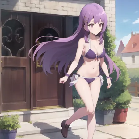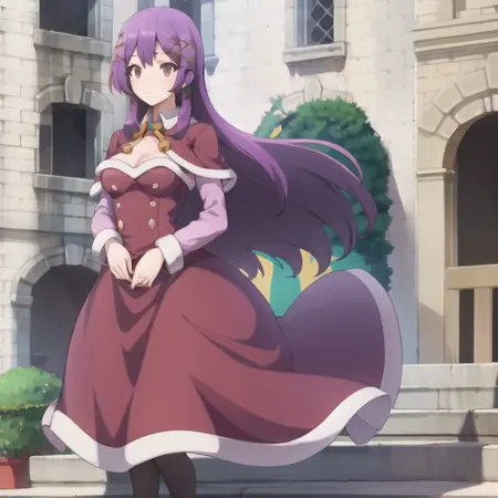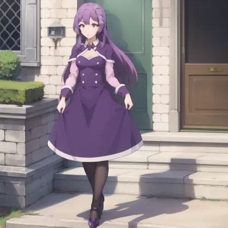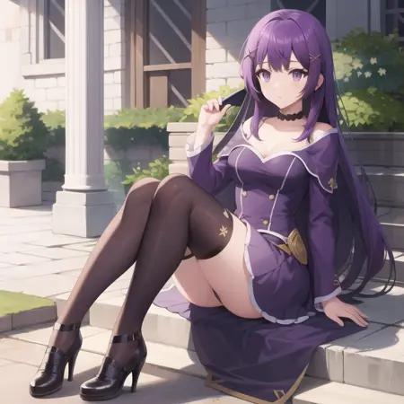 트리거 단어: icm-arcena, 긴 머리, 보라색 머리, 보라색 드레스, x 머리 장식, 앞머리