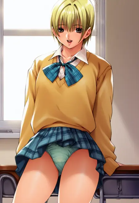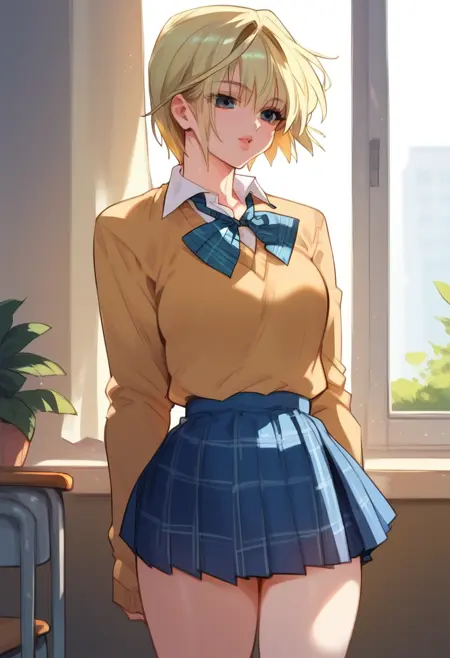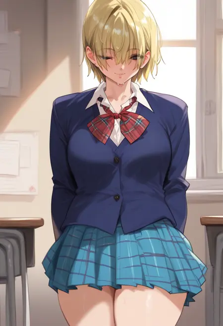 トリガー: tsukasa100、ショートヘア、金髪の女性、学校制服、長袖、チェックスカート
