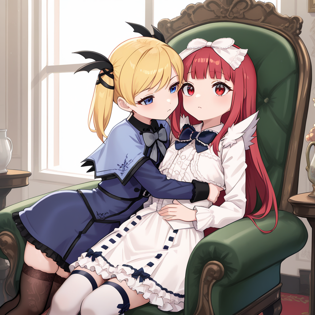 c_windia,red hair,red eyes,hair bow,bowtie,white dress,long sleeves,white skirt,white thighhighs,white footwear,footwear bow,angel wings