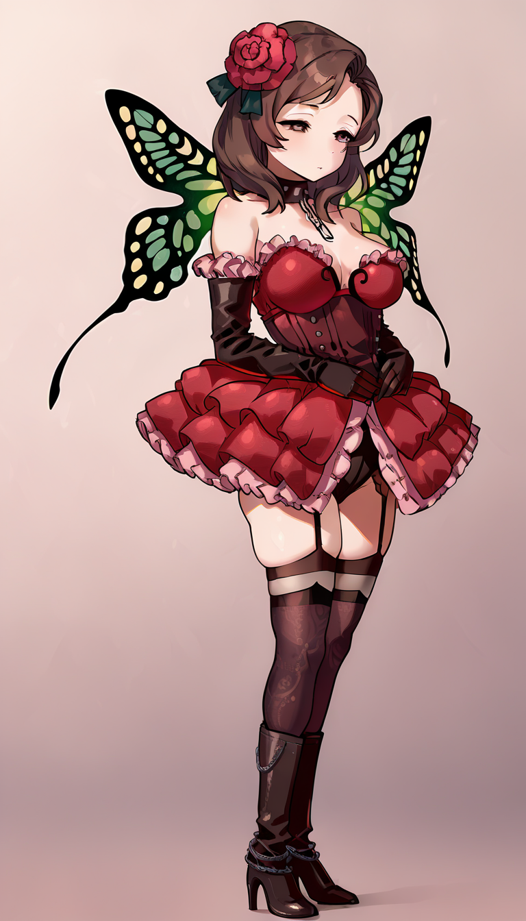 c_rosa,brown eyes,brown hair,medium hair,hair flower,choker,red dress,corset,bare shoulders,elbow gloves,black gloves,garter straps,thighhighs,high heel boots,butterfly wings