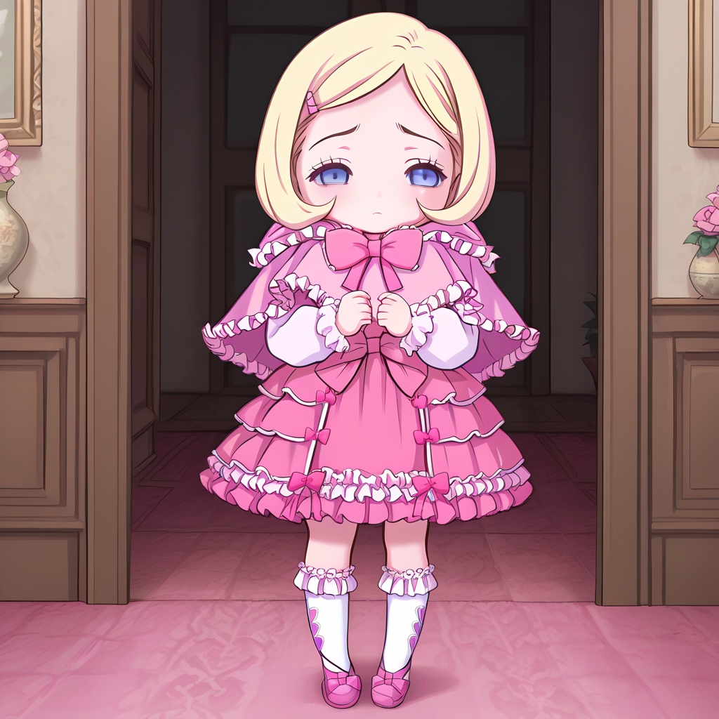 c_supe,child,blonde hair,blue eyes,pink hood,pink bow,pom pom \(clothes\),pink capelet,pink dress,white socks,kneehighs,pink footwear,pink wings