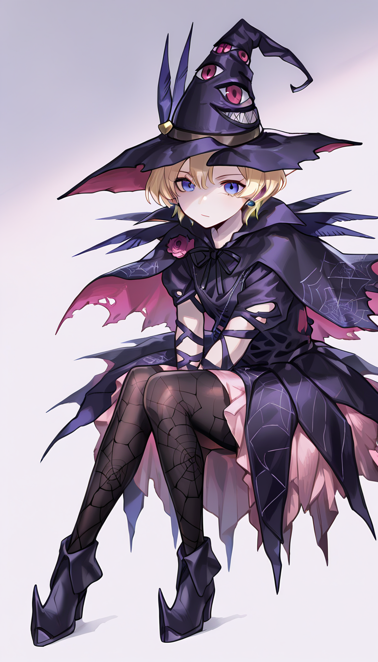 c_sakura,blonde hair,blue eyes,short hair,earrings,witch hat,black cape,neck ribbon,witch costume,webbed pantyhose,black footwear,pointy footwear