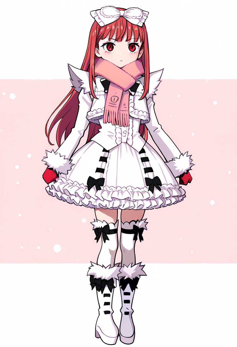 c_windia,red hair,red eyes,hair bow,pink scarf,red gloves,white dress,fur cuffs,long sleeves,white skirt,white thighhighs,white footwear,boots